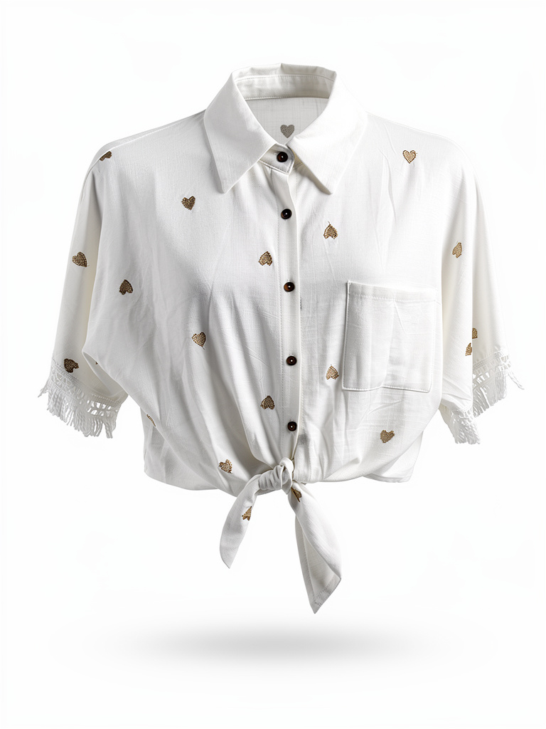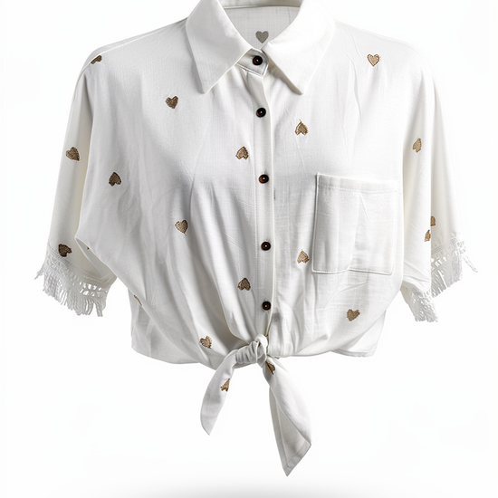 Aus weichem, luftigen Stoff gefertigt, sorgt sie für ein angenehmes Tragegefühl. Die feinen goldfarbenen Herzstickereien verleihen ihr einen verspielten, femininen Touch. Besonderes Highlight: die dekorativen Fransen an den Ärmeln und der modische Knoten vorne, der für eine lässige Silhouette sorgt.
